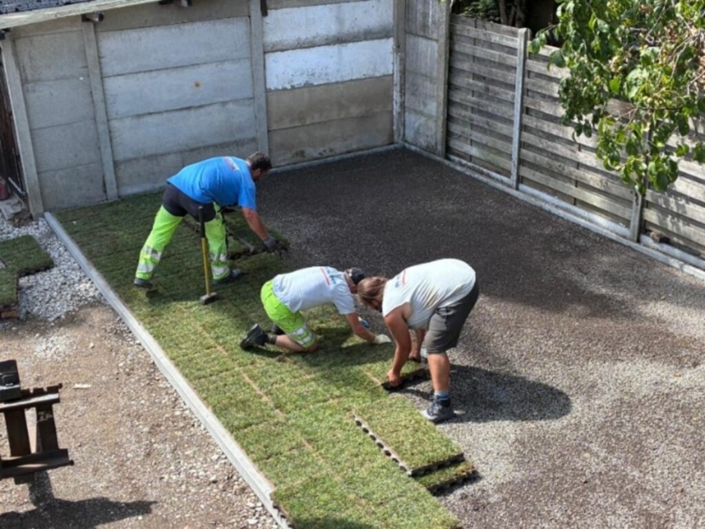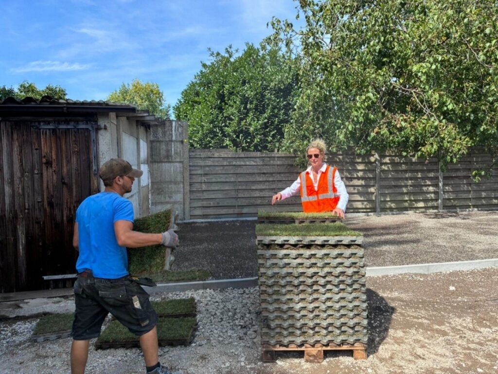 Maris Green Solutions, expert en solutions clés en main écologiques, s’est chargé de la préparation et de la plantation. L’entreprise a cultivé l’herbe directement sur les dalles TTE® et a fourni le mélange fertile de terre et de pierres ainsi que la couche de fondation pour une installation stable et durable.